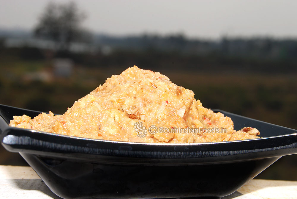 - Put roasted ingredients, tamarind, boiled horse gram and salt in a mixer jar & grind to coarse or fine paste. Add water if required.